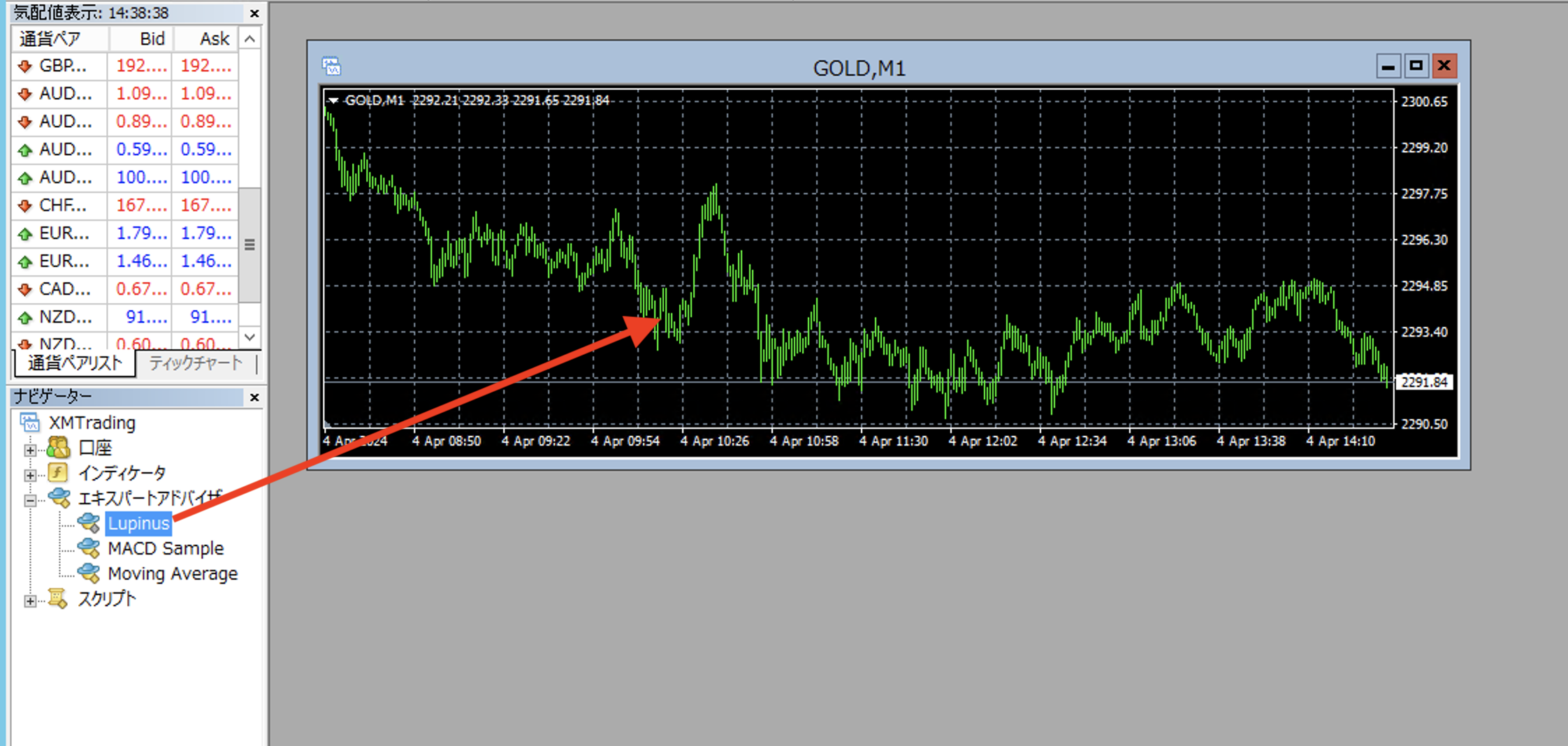 エキスパートアドバイザの「Lupinus」をチャートにドラックアンドドロップします。