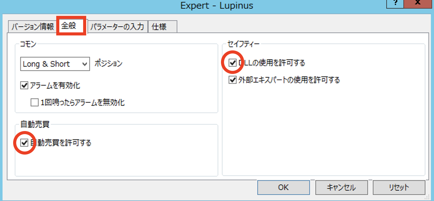 Lupinusをドラックアンドドロップをするとポップアップが表示されますので、「全般」タグをクリックして「自動売買を許可する」「DLLの使用を許可する」にチェックを入れてください