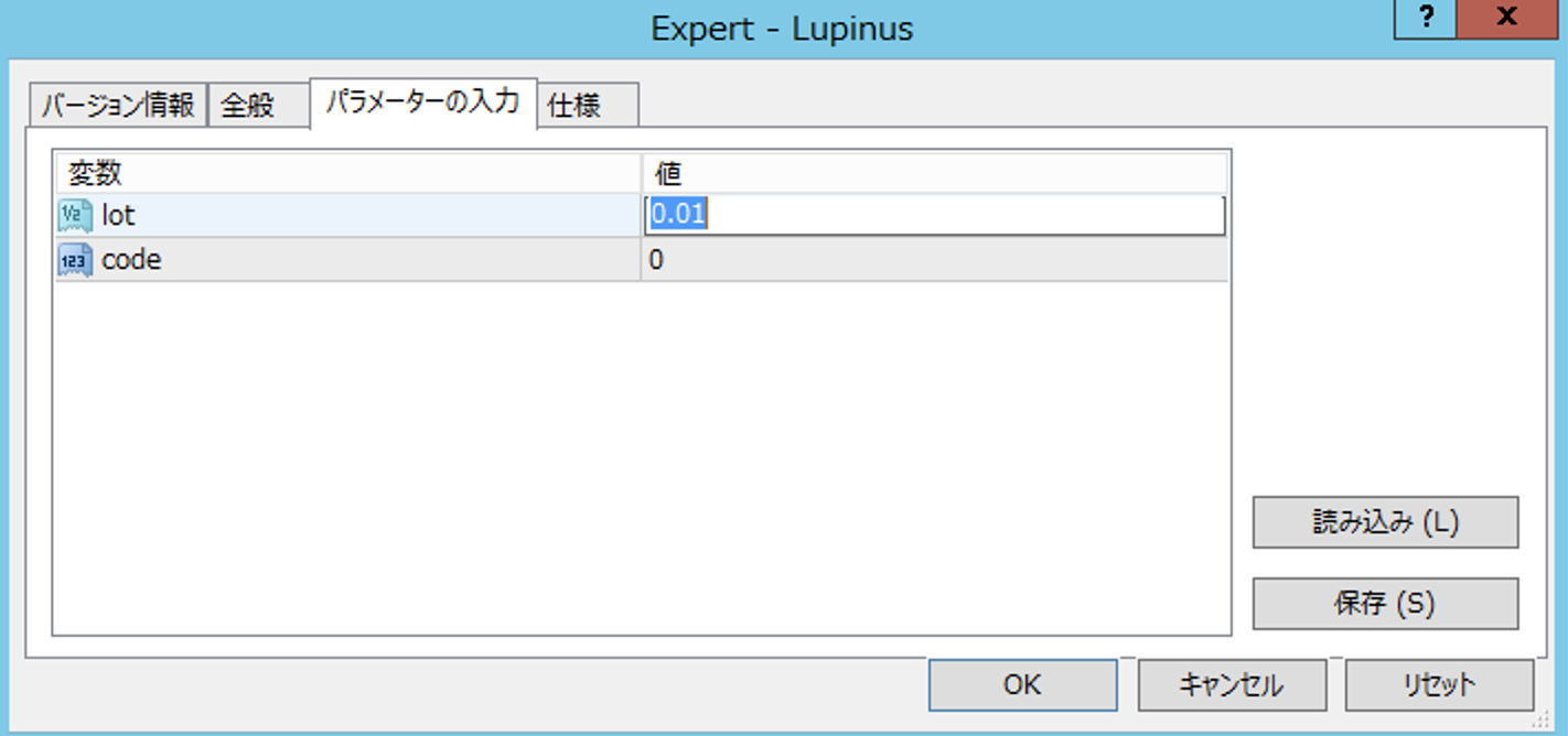次に「パラメーターの入力」タブをクリックして「ロット」を変更してOKをクリックしてください。